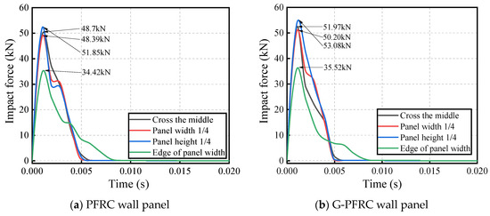 Figure 26 illustrates the impact force time-history curves of the PFRC and G-PFRC sandwich wall panels at various impact positions. Upon comparison, it is found that the maximum impact force occurs at one-quarter of the wall panel height, attributed to the closer proximity to the support and greater stiffness compared to other positions. At the edge of the wall panel, the impact force persists for the longest duration. The larger deformation and prolonged impact force duration at the edge indicate weaker stiffness in this region. Consequently, in practical engineering applications, attention should be given to mitigating the adverse effects of impact loads at this position, and certain measures should be implemented to enhance the stiffness of the wall panel at the edge.