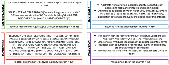 The eligibility assessment was conducted through a preliminary review of article abstracts. This step aimed to exclude studies that were thematically unrelated to modular construction or published outside the defined timeframe (i.e., before March 2020). All retained studies met the following eligibility criteria: (i) thematic relevance to modular construction; (ii) publication between March 2020 and April 2025; (iii) peer-reviewed journal article in its final version; (iv) written in English; (v) full-text availability under open access; and (vi) classified under the subject area of Engineering. A total of 386 articles met these requirements and were selected for full-text review in the subsequent phase.