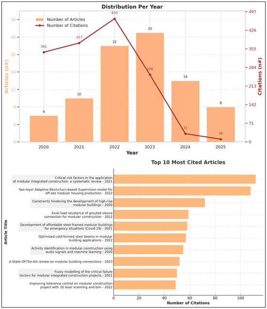 A cross-analysis between annual publication trends and the top 10 most cited articles (Figure 2) reinforces this pattern. Most of the highly cited works were published between 2020 and 2022, with 2022 alone contributing four of the ten. These studies focus on themes such as risk factors, design tolerances, failure modes, and systemic constraints, which are all topics that influence how modular construction is understood and operationalized. This indicates that the conceptual discourse has been significantly shaped during this period by academically impactful contributions. Although 2023 marked the highest number of publications, only one article from that year appears among the most cited, reflecting the expected citation lag.