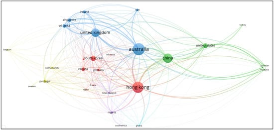 The country-based bibliometric analysis (Figure 3) highlights Australia, the United Kingdom, Hong Kong, and China as leading contributors to modular construction research. These countries not only have the highest number of publications but also form the strongest international collaboration networks. Their prominence is driven by factors such as rapid urbanization, innovation policies, and investments in industrialized building systems.