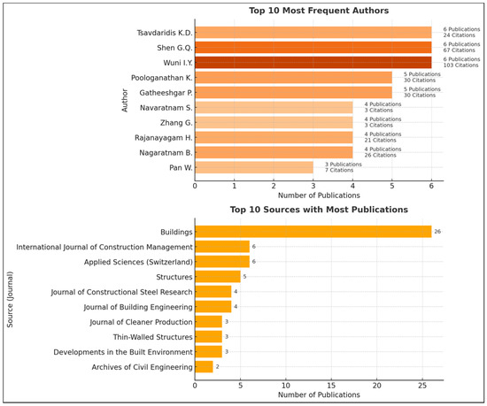 Likewise, the presence of Applied Sciences and the International Journal of Construction Management among the top sources reinforces the multidisciplinary and managerial dimensions of the field. Journals such as Structures and Thin-Walled Structures emphasize the structural engineering perspective, highlighting the technical depth involved in modular system design.