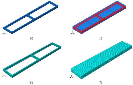 Finite element model of lightweight steel keel lightweight concrete composite wall panel: (a) CFS framing; (b) Skeleton embedded wall panel model and loading gasket; (c) Grid division of CFS framing; (d) Grid division of foam concrete wallboard.