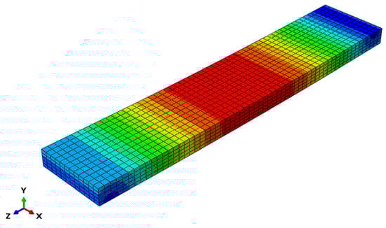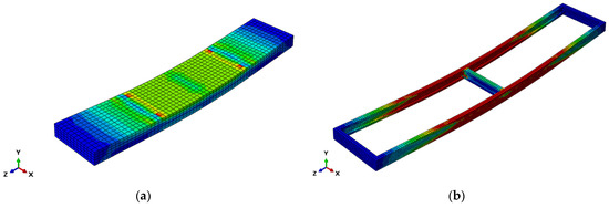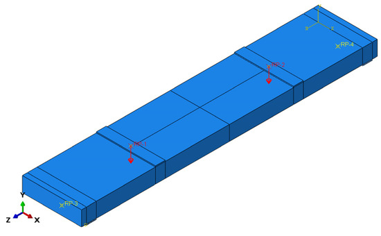 Displacement-controlled loading was applied at reference points. Reference points RP-1 and RP-2 at loading locations were subjected to 60 mm displacement in the negative Y-direction. Reference points RP-3 and RP-4 at support locations were configured as follows: RP-3 simulated a fixed hinge support (U1 = U2 = U3 = 0), while RP-4 represented a sliding hinge support (U1 = U2 = 0). The configuration after constraint application is shown in Figure 4.