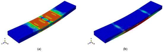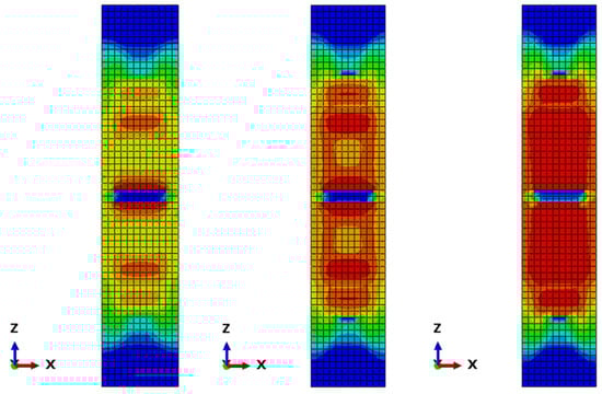 Figure 6 demonstrates three characteristic stages of tensile damage evolution in the wall panel, while Figure 7 presents corresponding damage contours for both tensile and compressive failure modes. The tensile damage pattern reveals primary cracking initiating at the slab bottom, with crack propagation originating from mid-span loading points (Figure 6). Progressive loading induces transverse crack development, extending laterally along the slab bottom and progressing vertically to approximately two-thirds of the sidewall height (Figure 7a). Compressive damage analysis in Figure 7b indicates stress concentration at the panel top mid-span region, confirming concrete crushing under incremental loading conditions.