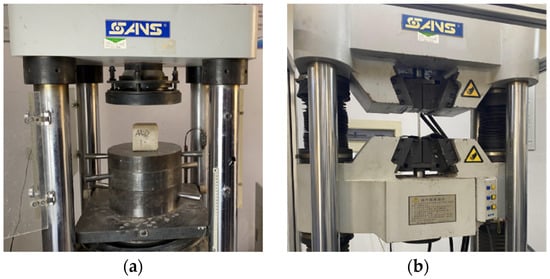 The material performance test for foamed concrete was conducted in accordance with Foamed Concrete JG/T 266-2011 [49] and Standard for Test Methods of Physical and Mechanical Properties of Concrete GB/T 50081-2019 [50]. Using foamed concrete from the same batch as the test specimens, two groups of 100 mm × 100 mm × 100 mm cubic specimens (A1 and A2) with different strength grades were cast, with three specimens in each group. After curing under identical conditions, compressive strength tests were performed. The experimental procedure is illustrated in Figure 11a, and the test results are presented in Table 5.