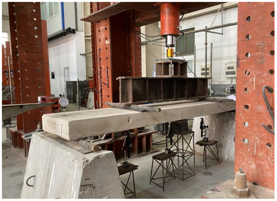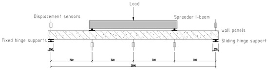 To simulate wind load effects on CFS-framed lightweight concrete composite wall panels, all specimens underwent four-point bending tests with quarter-point concentrated loading. The experimental setup is illustrated in Figure 12 and Figure 13. A hydraulic jack with 63 MPa capacity applied loads through a distribution beam directly onto the panel, with 1400 mm spacing between loading points (1/4 of the total span). A BLR-1 type 10-ton load cell recorded applied loads. Displacement transducers were positioned at quarter-span, mid-span, and three-quarter-span locations along the panel length to measure deflection. Mechanical displacement transducers mounted at both end supports compensated for settlement effects on deflection measurements. This configuration enabled determination of cracking load, yield load, and ultimate load to evaluate the flexural capacity of the exterior wall panel system.