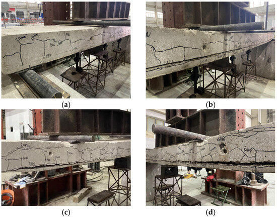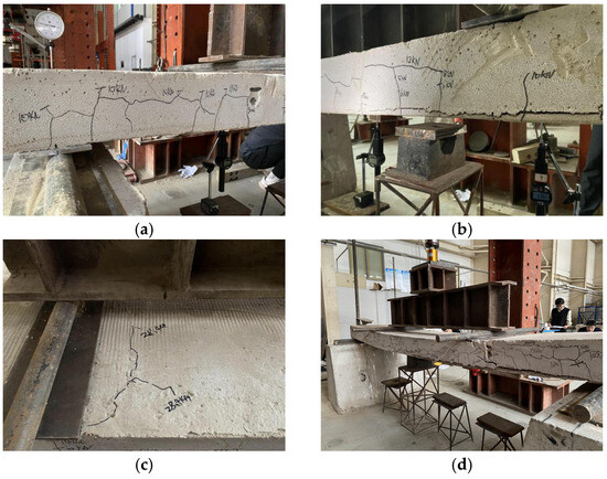 Upon observation of significant plastic deformation in the specimen, the control mode was switched to mid-span displacement control, using 2 mm vertical displacement increments at mid-span as the loading criterion. Loading continued until termination conditions were met, including (1) substantial reduction in load-bearing capacity, (2) crack width exceeding limit values, or (3) occurrence of brittle failure, thereby completing the full observation of structural failure progression.
