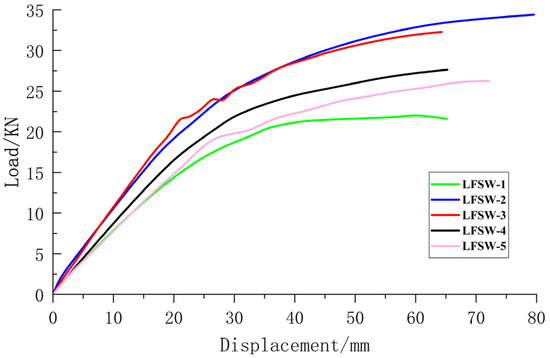 During the cracking stage, the relatively low-strength foamed concrete resulted in cracking displacements susceptible to external factors including specimen fabrication and handling processes. Nevertheless, specimens LFSW-2 (with increased framing thickness) and LFSW-4 (with enhanced concrete cover) exhibited notably smaller cracking displacements. At the yielding stage, measured deflections reached 33.44 mm, 44.11 mm, 37.99 mm, 39.86 mm, and 41.88 mm, respectively, representing 5.57–14.09 times the cracking-stage values—a quantitative demonstration of the specimens’ substantial deformation capacity and safety reserves.