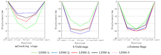 Figure 22 illustrates the bending deformation profiles along the longitudinal direction for all five specimens during cracking, yielding, and ultimate stages, exhibiting characteristic sinusoidal half-wave patterns. The maximum displacement consistently occurred at mid-span for all specimens except LFSW-5, which demonstrated unique behavior with peak displacement at quarter-span during yielding and near-equal displacements at quarter-span and mid-span at failure.