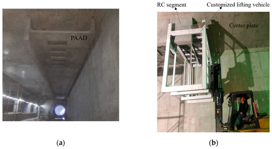 The prefabricated assembly air duct (PAAD) is newly developed for application in the ventilation system of the subway station. As shown in Figure 1a, the PAAD is a fully prefabricated assembly reinforced concrete (RC) structure in the subway station. In the construction of the PAAD, the RC segment is firstly prefabricated on the ground (step 1) and then transported into the interior of the subway station (step 2), where it is lifted and assembled using a customized lifting vehicle thereafter (step 3), as shown in Figure 1b. Moreover, the interface optimization of the PAAD is carried out after the lifting is completed.