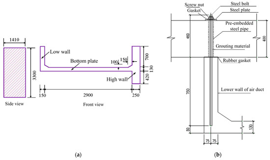 The assembled RC segments are fixed by the assembly node, as shown in Figure 2b, which mainly includes the steel bolt, pre-embedded steel pipe, and grouting material. The compressive and tensile strengths of the grouting material are 30 MPa and 2.3 MPa, respectively, and the diameter of the bolt is 22 mm. The bolt holes with 50 mm diameter are drilled in the existing slab of the subway station, which are employed for installing the high and low walls of the PAAD. Moreover, the steel pipe with 2.5 mm wall thickness is also pre-embedded in the high and low walls of the PAAD.