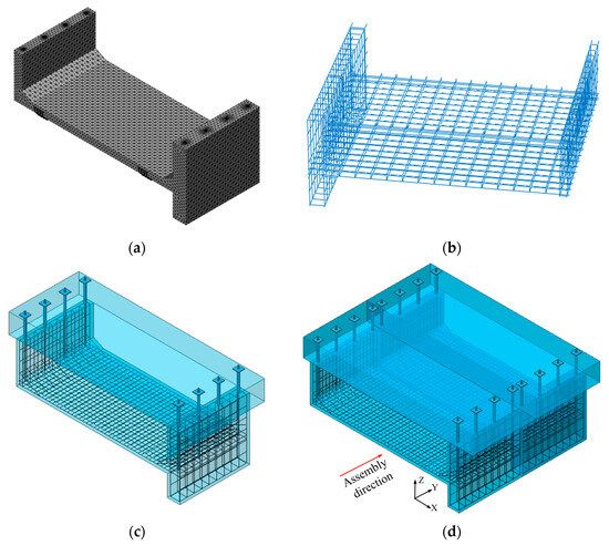 Numerical models for investigating the mechanical performance of PAAD: (a) individual segment; (b) reinforcements in segment; (c) individual segment with sleeve grouting connection; (d) assembled segment with sleeve grouting connection.
