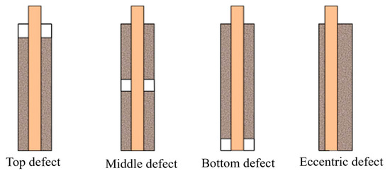 Numerical analysis is implemented to investigate the mechanical performance of the PAAD influenced by the assembly error defects and sleeve grouting defects, in which all the simulated numerical models with and without defects are listed in Table 2. The grouting defects in the sleeve grouting connection are shown in Figure 4, in which the top, middle, and bottom defects represent the grouting defects located at the top, middle, and bottom positions of the connection joint, respectively, and the eccentric defect denotes the deviation of the steel bolt and sleeve. Moreover, the aforementioned grouting defects are probably caused by grouting leakage with a loose top sealing or port, air inside the sleeve, debris blocking at the sleeve bottom, or an inaccurately positioned sleeve, respectively. In the numerical analysis, the assembly error defects are, respectively, assumed as 2 mm, 5 mm, and 10 mm along the assembly direction, all the lengths of the grouting defects at the top, middle, and bottom positions of the sleeve grouting connection are assumed as 20 mm, and the eccentric defect in the sleeve grouting connection is assumed as 5 mm.