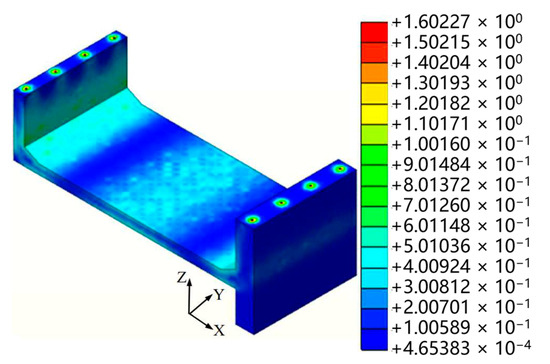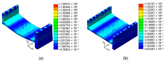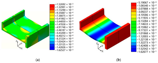 Figure 7 demonstrates the vertical displacement of the assembled segments without defects after the sleeve grouting process compared with that of the cast-in-place segment. It can be obviously seen that the vertical displacements of both the assembled and cast-in-place segments are symmetrically distributed, in which the vertical displacements of the low and high walls are significantly less than that of the bottom plate in both segments. Moreover, the maximum vertical displacements of the assembled and cast-in-place segments are 0.161 mm and 0.056 mm, respectively, both of which are located in the middle of the bottom plate and met the safety requirements.