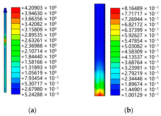 Figure 6 demonstrates the stress distributions of the steel bolt and grouting material in the sleeve grouting connection joint without defects. Both the steel bolt and grouting material are subject to tensile stress; the tensile stress of the steel bolt decreases from the middle to both sides, and that of the grouting material gradually increases from top to bottom, in which the maximum tensile stress of the steel bolt is located in the middle of the steel bolt, and that of the grouting material is located at the bottom of grouting material. Moreover, the maximum tensile stresses of the aforementioned steel bolt and grouting material are 4.2 MPa and 0.8 MPa, respectively, which are less than the tensile strengths of the steel bolt and grouting material.