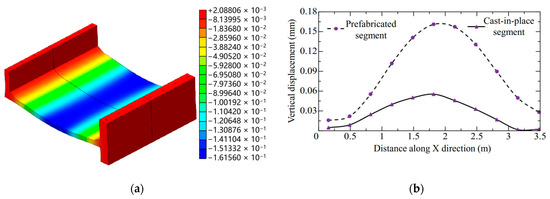 Vertical displacement of cast-in-place and assembled segments without defects (unit: mm): (a) displacement distribution; (b) displacement curves.