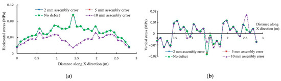 Figure 8 shows the stress curves of the assembled segments considering the defects of the varied assembly errors of 2 mm, 5 mm, and 10 mm compared with those of the assembled segments without defects, in which the assembly error defect is assumed along the assembly direction (Y direction). All the assembled segments with the varied assembly errors are subject to tensile stress in the horizontal direction, and they are subject to both the tensile and compressive stresses in the vertical direction, in which the horizontal stresses are greater than the vertical stresses. Moreover, the horizontal and vertical stress curves of the assembled segments with 2 mm and 5 mm assembly errors are consistent with those of the assembled segments without defects, in which the maximum horizontal and vertical stresses occur at the assembly contact surface. In addition, the stress curve of the assembled segments with 10 mm assembly error is varied from those of the aforementioned assembled segments with 2 mm and 5 mm assembly errors.