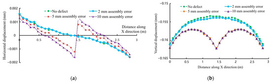 Displacement curves of the assembled segment considering the defects with varied assembly errors: (a) horizontal displacement; (b) vertical displacement.