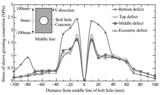 Figure 12 demonstrates the stresses of the sleeve grouting connection joint with the aforementioned typical grouting defects shown in Figure 4. It can be clearly seen that all the sleeve grouting connection joints are subject to tensile stress, with obvious stress concentration around the bolt hole, in which the maximum tensile stresses of these sleeve grouting connection joints with grouting defects are located at the edge of the bolt hole. Moreover, the maximum tensile stresses of the concrete in the sleeve grouting connection with top, middle, bottom, and eccentric defects are 1.79 MPa, 1.76 MPa, 2.42 MPa, and 1.64 MPa, respectively, in which the aforementioned 2.42 MPa is greater than the tensile strength of concrete at 2.2 MPa. This implies that the bottom defects in the sleeve grouting connection joint can induce the failure of the concrete around the connection joint, and a strengthening treatment is required for ensuring the structure’s safety and reliability.