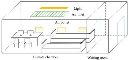 The experiment was carried out in a climatic chamber located in the Shibei Campus of Qingdao University of Technology. Environmental parameters, including air temperature and relative humidity, were maintained at the thermoneutral condition (24 ± 0.5 °C, 55 ± 5%, respectively), as recommended by ISO 7730 []. The chamber had the dimensions of 5000 mm × 3000 mm × 2600 mm (L × W × H), with a waiting room and an experimental room, as shown in Figure 1. Other environmental parameters were set up, according to office environments recommendations by related standards. Specifically, the illuminance of the lighting devices was fixed at 500 lx [], the air velocity near these desks was controlled at 0.1 m/s [], and the indoor CO2 concentration was controlled at approximately 700 ppm []. To mitigate individual differences in thermal sensation, participants were permitted to adjust their clothing flexibly, to maintain thermoneutrality. Consequently, the confounding effects of lighting condition, air movement, CO2 concentration, and thermal comfort could be eliminated well.