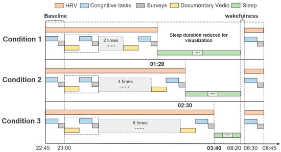 Three sleep-restriction conditions with different durations were designed: specifically, the mild (Condition 1, ending at 01:20), moderate (Condition 2, ending at 02:30) and severe (Condition 3, ending at 03:40) sleep restriction. Regarding the classification of mild, moderate, and severe sleep restrictions, while some academic debate remains, the design of this study was supported by the existing literature. The 4.7 h of sleep per night was defined as severe sleep restriction by reference [], and even longer sleep durations were employed in the mild and moderate sleep-restriction protocols by reference []. Two participants were engaged in each experiment. A minimum interval of seven days was required between two sleep-restriction conditions, to ensure the full elimination of effects of the former one. In addition, the time and date displayed on the displays of computers were concealed, to make participants unaware of the time of the undergoing experiment. Therefore, they did not know the specific sleep-restriction condition until the completion. Additionally, participants were required to alternately complete cognitive tasks and watch the documentary video ‘Aerial China’ during sleep restriction periods. This combined protocol was designed to simulate multidimensional resource-allocation demands in real-world overtime work. The standardized documentary stimulus was selected because its continuous narrative flow requires sustained attentional engagement, comparable to routine monitoring operations (e.g., quality control surveillance), while its passive nature minimizes movement artifacts in physiological recordings. Critically, alternating active cognitive tasks enables precise titration of competing resource dimensions, including perceptual, attentional, and working memory systems, thus generating cumulative fatigue through controlled resource competition, as described in multidimensional workload models [].