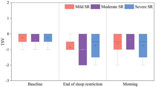 Thermal sensation vote (TSV) scores under these three sleep-restriction conditions are illustrated in Figure 3. As shown by Figure 3, TSV scores were predominantly distributed within the ‘slightly cool’ range (−1 < TSV < 0) for all conditions, with no statistically significant differences observed among conditions (p > 0.05). This finding confirmed that cognitive performance changes during all three sleep restrictions were not produced by thermal environments.