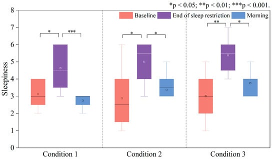 Changes in subjective sleepiness under and after three sleep-restriction conditions are presented in Figure 4. The subjective sleepiness increased significantly from baseline to the end of each sleep restriction (p < 0.05), with greater escalation observed under longer sleep-restriction durations (Condition 3). Following the recovery sleep, morning assessments revealed reductions in subjective sleepiness, which were confirmed to be significantly lower than at the end of each sleep restriction (p < 0.05). The most pronounced recovery (or sleepiness reduction) was observed in Condition 1 (mild restriction, p < 0.001), whereas Condition 3 (severe restriction, p < 0.05) showed a less effective recovery.
