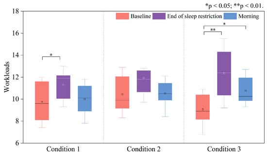 Variations in perceived workload for all three sleep-restriction conditions are illustrated in Figure 5. At the end of each sleep restriction, significant increases in perceived workload relative to baseline were detected only in Conditions 1 (p < 0.05) and 3 (p < 0.01), while Condition 2 just had a slightly upward pattern (p > 0.05). In morning assessments, perceived workload reduced for all conditions compared to the level at the end of each restriction (p > 0.05). Specifically, a significant difference was observed between baseline and morning assessments in Condition 3 (p < 0.05). Notably, shorter sleep restrictions corresponded to lower perceived workloads in the morning.
