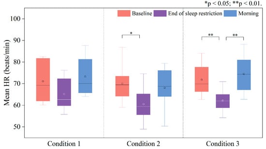 The next morning, mean HR for all conditions returned to levels close to or slightly over baseline levels (Cohen’s dMild = 3.54, Cohen’s dModerate = 11.79, Cohen’s dSevere = 4.46). Conditions 1 and 2 showed less increase, while Condition 3 had a significantly higher mean HR than at end of its sleep restriction (ΔHR = 13.96, p < 0.01, Cohen’s d = 4.64). These results indicated a negative correlation between sleep-restriction duration and mean HR in sleep restrictions.