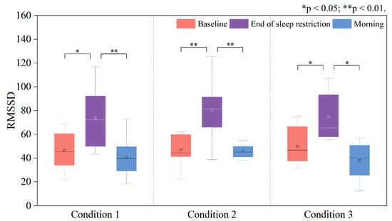 Figure 6 and Figure 7 present the variations in mean heart rate (HR) and the HRV time-domain index RMSSD for three sleep-restriction conditions. Overall, as shown in Figure 6, a downward pattern of the mean HR was observed during all sleep-restriction conditions compared to baseline levels. In Condition 1, mean HR reduced from the baseline level 71.06 beats/min to 65.18 beats/min, although no significant differences were observed (p > 0.05, Cohen’s d = 3.84). In contrast, Conditions 2 and 3 showed significant reductions in mean HR, from 69.99 beats/min and 71.80 beats/min to 60.51 beats/min (ΔHR = −9.48, p < 0.05, Cohen’s d = 3.09) and 62.11 beats/min (ΔHR = −9.69, p < 0.01, Cohen’s d = 3.88), respectively.