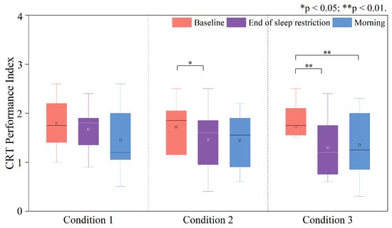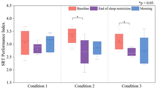 The Deary–Liewald task comprises the Simple Response Time (SRT) task and the Choice Response Time (CRT) task, which assess sustained attention and selective attention, respectively. Variations in the Performance Index (PI) of the SRT task under these three sleep-restriction conditions are illustrated in Figure 8.