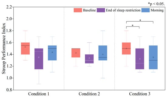 The Stroop task is a measure of selective attention, inhibitory control, working memory, and executive function. Variations in PI of the Stroop task under and after these three sleep-restriction conditions are illustrated in Figure 10. As depicted in Figure 10, the mean PI at the end of each sleep restriction was reduced, compared with the baseline levels, for all three conditions. However, statistically significant reduction was observed only in Condition 3 (ΔPI = −0.17, p < 0.05, Cohen’s d = 0.14).