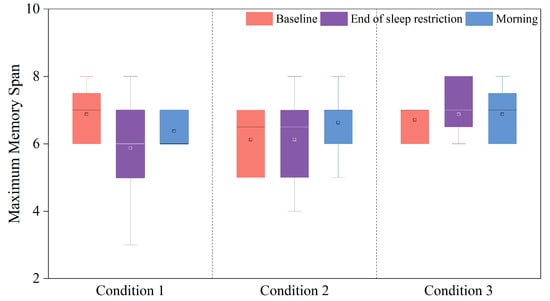 Spatial working memory and short-term memory are measured by the Corsi Block task. Changes in the maximum memory span during the Corsi Block task under these three sleep-restriction conditions are presented in Figure 11. It was found that changes in maximum numbers of the task showed divergent changes for all three sleep-restriction conditions. No similar pattern was observed. Meanwhile, no statistical significance was observed for all these changes in all three conditions.