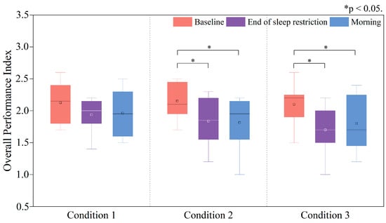 Variations in the OPI under and after these three sleep-restriction conditions are illustrated in Figure 12. In Condition 1, no statistically significant changes in the Overall Performance Index (OPI) were observed from baseline to the end of the restriction, or the next morning (all comparisons, p > 0.05). Although the OPI was numerically lower than baseline at the end of the restriction and numerically higher than the end-of-restriction level in the morning, these differences did not reach statistical significance. For Conditions 2 and 3, significant reductions in OPI were observed at the end of each condition (Condition 2 ΔOPI = −0.30, p < 0.05, Cohen’s d = 0.26; Condition 3 ΔOPI = −0.40, p < 0.05, Cohen’s d = 0.33), compared with the baseline levels. However, the morning mean OPI rose slightly in Condition 3 (p > 0.05, Cohen’s d = 0.23), and did not change much in Condition 2 (p > 0.05, Cohen’s d = 0.39), compared with that at the end of each condition. In addition, it was found that the morning mean OPI in Condition 2 and 3 was significantly lower than the baseline levels (Condition 2 ΔOPI = −0.33, p < 0.05, Cohen’s d = 0.15; Condition 3 ΔOPI = −0.30, p < 0.05, Cohen’s d = 0.25).