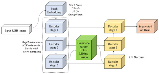 Each subsequent level halves the spatial resolution. The decoder then performs three successive feature fusion steps to generate logits in the original resolution. The stem comprises a single 3 × 3 convolution (stride = 1, channels = 32) followed by Group Normalization (G = 8) and in-place ReLU activation. Batch-independent normalization is essential because (i) hardware constraints limit the mini batch to four images and (ii) thin-structure datasets exhibit highly skewed activation statistics between background and foreground pixels. GroupNorm eliminates the variance drift frequently observed with BatchNorm under such conditions. The encoder is formed by four BAT stages. Each stage begins with a stride-2patch-down sampling block that halves resolution and doubles channels, followed by repetitions of a BATM-MLE pair. Common axial attention modules divide attention windows along both height and width, incurring quadratic complexity . For rock joint segmentation, the visual signal is primarily one-pixel-wide ridges, oriented arbitrarily, exhibiting global connectivity in the horizontal direction due to geological continuity. BATM exploits this asymmetry. Let ; horizontal stripe tokens are generated by average pooling non-overlapping stripes of width S. Simultaneously, patch tokens follow standard patch flattening. In bidirectional attention, tokens are concatenated, projected into 3C-dimensional query, key, and value spaces, and processed by a multi-head attention mechanism: