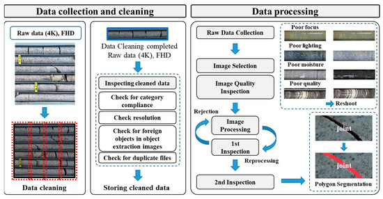 The dataset employed in this study was produced within the 2023 Artificial Intelligence Training Data Construction Program sponsored by the Korean Ministry of Science and ICT and the National Information Society Agency. All images belong to the disaster safety domain and are intended for the automation of a rock quality assessment at the point of sample collection. The whole process of data preparation is shown in Figure 2. The associated metadata schema, file formats, and intended use are summarized in Table 2. A total of 661,425 high-resolution photographs of hard rock drill cores were collected under strictly standardized conditions so that subsequent quantitative analyses would be reproducible and statistically sound.