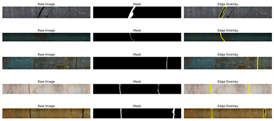 Figure 3 presents a selection of five representative drill core images with their mask. For each image, the left images show the 24-bit RGB photograph acquired at the native resolution. The center images display the binary ground truth mask in which white pixels denote rock joint and black pixels denote intact lithology; the right images overlay the automatically extracted fracture boundaries (yellow) on the raw image to highlight centimeter-scale edge fidelity. The examples deliberately span the full range of lithological classes contained in the corpus, such as igneous, metamorphic, and sedimentary, and include both high-contrast, sharply bounded fractures as well as diffuse, clay-filled, or weathered discontinuities. Variations in surface roughness, mineral mottling, and illumination gradients are likewise represented, illustrating the heterogeneity that any learning algorithm must accommodate. The dataset was partitioned on a borehole basis into mutually exclusive 70%, 15%, and 15% for training, validation, and test, respectively.