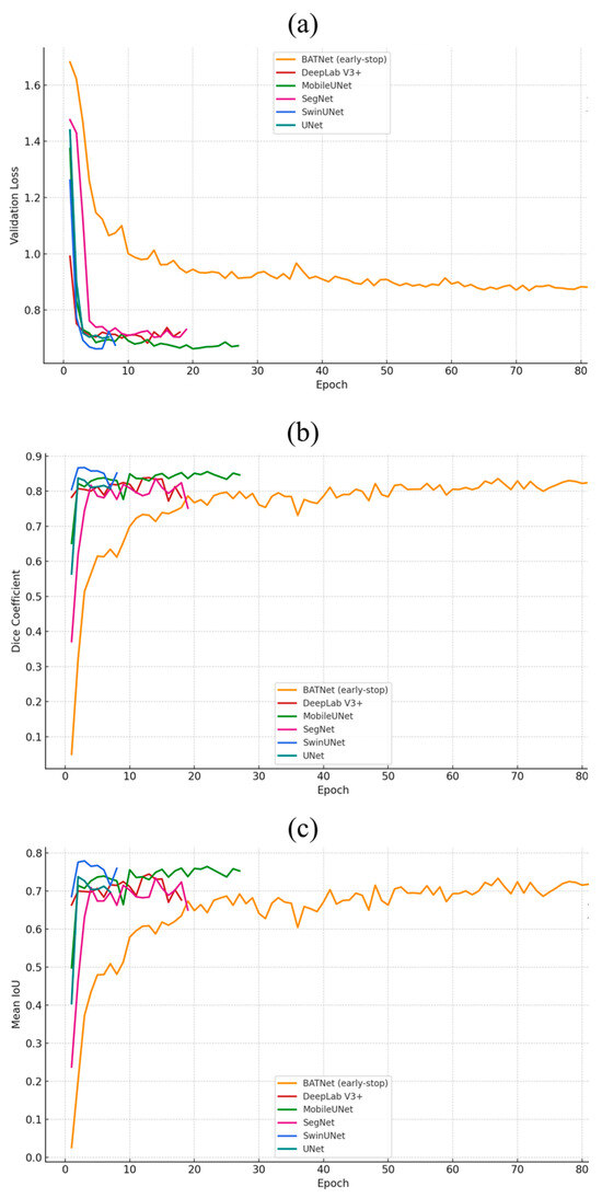 Early stopping with a patience of five epochs was applied to every model, mirroring common industrial practice in which training ends once validation performance ceases to improve. Figure 5 plots the corresponding Dice, mean IoU, and validation loss trajectories. Because BATNet-Lite was initialized from random weights, its first epoch Dice and mean IoU were more than 0.5 lower than those of the ImageNet pre-trained baselines. Nevertheless, the network achieved the most rapid improvement, tripling both metrics within the first ten epochs and closing approximately two-thirds of the initial performance gap.