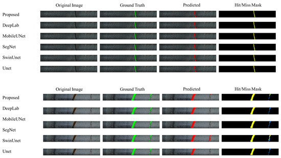 For two representative core-surface patches (upper block: hairline joint; lower block: oxide-stained joint), Column 1 shows the original RGB image (512 × 128 px). Column 2 overlays the manually annotated ground truth skeleton (green), Column 3 overlays the network prediction (red), and Column 4 visualizes the overlap/error map (yellow = true positive pixels, blue = false negative pixels, and black = true negative background). Rows list the tested architectures, our Boundary-Aware Token-Mixing Network (proposed), DeepLabV3+, Mobile-UNet, SegNet, Swin-UNet, and UNet, trained under identical data splits and hyper-parameters. The proposed network yields the most coherent and tightly aligned segmentation, whereas competing CNN- and transformer-based baselines exhibit visible discontinuities, thickness drift, or omissions.