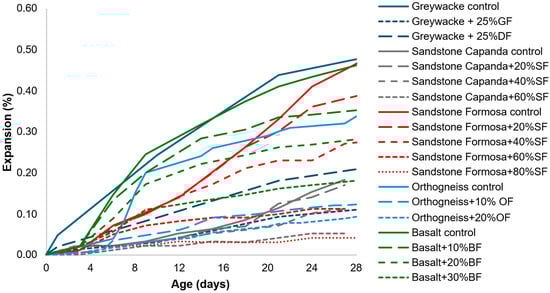 Expansion results of systems with reactive coarse aggregates and reactive fillers (SF: sandstone filler; DF: dacite filler; GF: greywacke filler; BF: basalt filler; OF: orthogneiss filler). Greywacke data from [62]; Sandstone data from [63]; Orthogneiss data from [64]; Basalt data from [65].