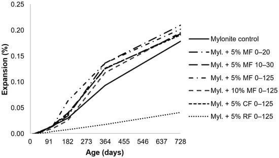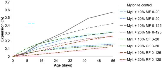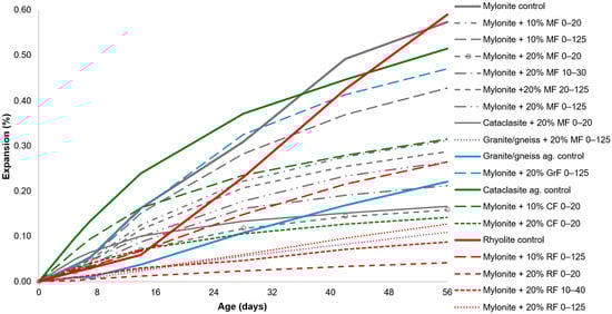 As observed, the AMBT results obtained with the Norwegian standard were similar to those obtained using the ASTM standard (Figure 1), that is, lower expansions with the use of AMFs. The parameters evaluated were the type of AMFs (i.e., mylonite (MF), granite (GrF), cataclasite (CF), rhyolite (RF)), PSD (i.e., 0–20 µm, 10–30 µm, 10–40 µm, 20–125 µm, 0–125 µm), and percentages (i.e., 10% and 20%). The mixtures with reactive AMFs (dashed lines) resulted in reduced ultimate expansion compared to the control curves (solid lines). The exception was the mixture with mylonite as aggregate and 20% GrF, with higher expansions than the control mixture.