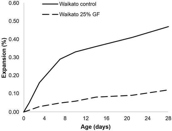 Few studies evaluated systems with fine reactive aggregates [62,67]. In this regard, the AMBT was used to assess a combination with reactive Waikato natural river sand and reactive AMFs produced from a greywacke (GF), and replacing 25% of cement (Figure 3). Fine reactive aggregates usually exhibit a faster rate of reaction [50,68], reaching considerable expansion levels at early ages, as observed in the figure by the steep inclination of the control curve. When using GF in Figure 3, the rate of reaction was slowed. Moreover, the maximum expansion was reduced from 0.47 to 0.12, representing a reduction of approximately 74%.