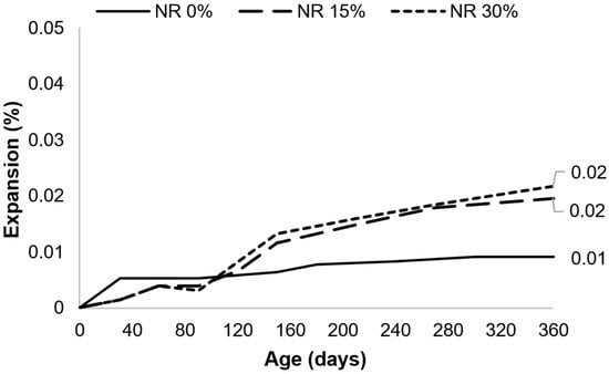 In addition to systems with reactive aggregates, the study of non-reactive systems, in which reactive AMFs and non-reactive aggregates are used, is very important but has not been extensively addressed in previous studies. This type of analysis was found in one study in which limestone fillers were used in percentages of 15% and 30% (50% replacing cement and 50% replacing sand) [69]. As observed in Figure 5, the use of the reactive AMFs resulted in increased expansions. Despite the different percentages, the expansions after 1 year for both replacement levels were similar. However, compared to the control curve, the average ultimate expansion was two times higher.