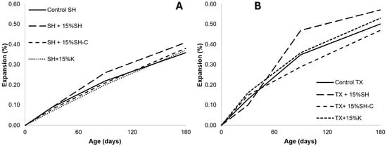 Moreover, the ACPT was utilized to evaluate a system incorporating a highly reactive sand (i.e., Texas sand—TX) and AMFs from greywacke (SH) and limestone (K), which are ASR- and ACR-reactive, respectively, replacing 15% of cement and sand (Figure 6B).