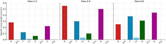 The methods used to evaluate the deterioration progress of systems with AAR-reactive AMFs were surface cracking [70] along with the damage rating index (DRI) and stiffness damage test (SDT) [67]. For the surface cracking evaluation, prisms of 7 × 7 × 28 cm stored at 60 °C with 20% AMFs replacing sand were stored for 34 weeks. As observed in Figure 7, for all the faces of the prisms (Faces 1–3 and 2–4 are opposed and rectangular and Faces 5–6 are square-shaped and located at the extremities), a drastic reduction in surface cracking was observed for samples with a reactive aggregate and 20% of sand replaced by AMFs derived from the same aggregate (i.e., metaquartzite (o): 100% reduction; siliceous limestone (t): approximately 90% reduction; opaline aggregate (b): 100% reduction; crushed waste glass (g): 100% reduction).