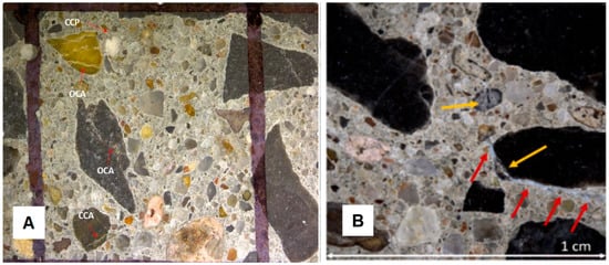 (A) Important features used to determine the DRI of a sample (CCP: crack in cement paste; OCA: open crack in aggregate; CCA: closed crack in aggregate) [67]. (B) Sample with limestone filler replacing 15% of cement. Yellow arrows indicate cracks in aggregate particles and red arrows indicate cracks in the cement paste (Courtesy of the author of [73]).