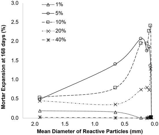 Stanton [98] studied a siliceous magnesium limestone containing opal and chalcedony and determined that if this aggregate is sufficiently fine (<180 µm), no expansion occurs. In his work, he also indicated that when the aggregate has a reduced size, the gel dissipates in the cementitious matrix such that no tension is generated, and the reaction terminates before the final setting of concrete. In contrast, Vivian [99] found that expansions increase with the reduction of particle size until it reaches 50 µm, from which no expansion is observed, as shown in Figure 9.
