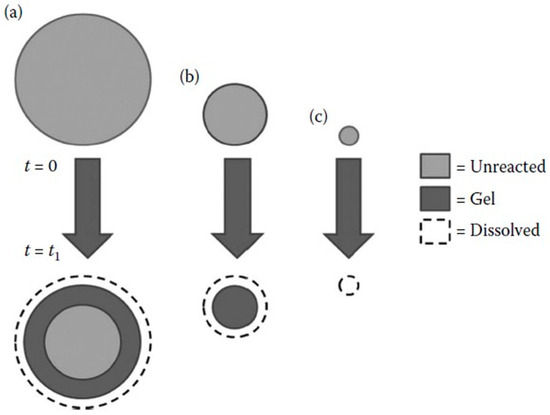 Effect of a relatively fast rate of ASR gel formation and a slow rate of gel dissolution over a period t1. Large particles (a) produce relatively large volumes of gel as they react. Smaller particles (b) become entirely converted to gel, which then gradually dissolves. Very small particles (c) are dissolved entirely in a relatively short period of time [92].