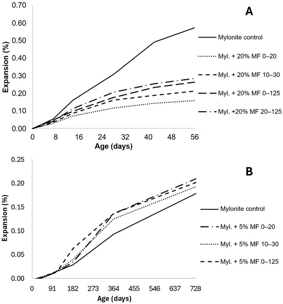 Figure 6A shows the expansion results of mixtures with AAR-reactive AMFs using the ACPT.