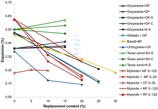 Impact of replacement content of cement by reactive AMFs on AAR expansions. Greywacke GF/DF and Waikato data from [62]; Greywacke GF-S/GF-C/K-S and Texas sand data from [67]; Basalt data from [65]; Orthogneiss data from [64]; Mylonite data from [66].